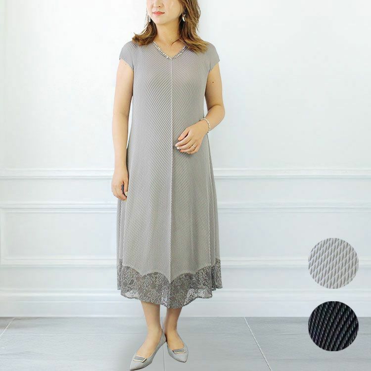 プリーツ加工された生地を前身頃のセンターから、八の字(逆V字型)に切り替えたロングワンピース。縦のラインが強調され、スタイルアップ見えも叶うデザインです。裾のレースが繊細で華やかな雰囲気。スパンコールを配したVネックが首元をスッキリと見せてくれます。自宅で手洗いが可能で手入れがしやすく、シワになりにくいのも特徴。裏返してくるくる丸めてコンパクトに収納することが可能なので、旅行にもおすすめです。