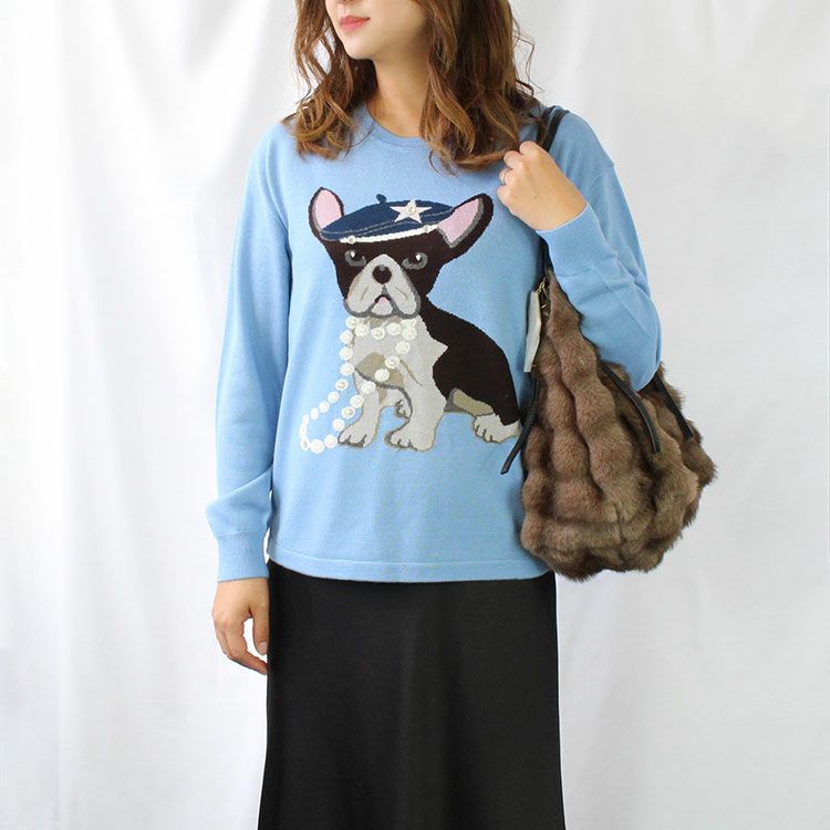 パールネックレスや帽子を身につけたおしゃれなフレンチブルドッグがキュートな、一枚で様になるデザイン。裾にかけてストレートなシルエットで落ち感があるのでスッキリとした印象に。