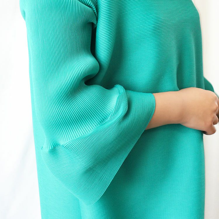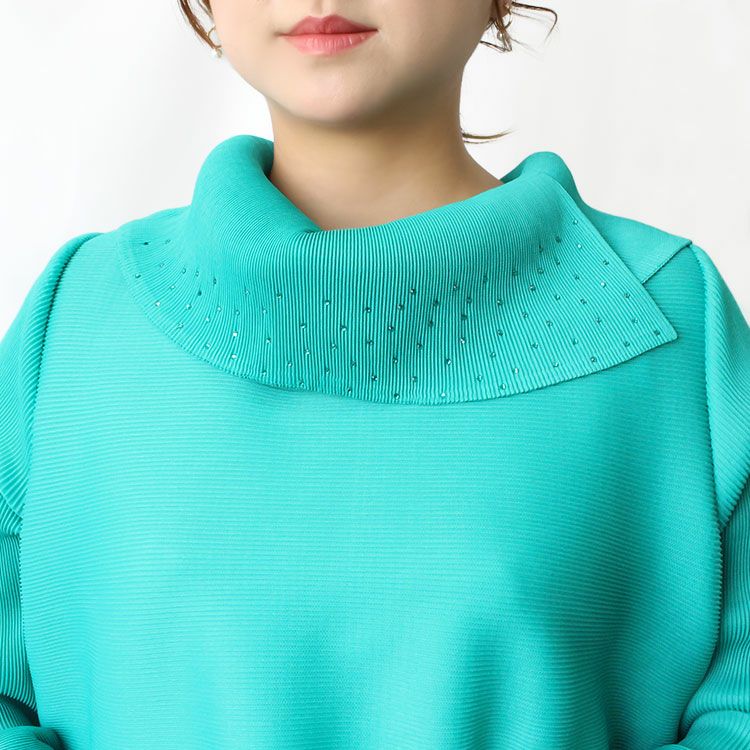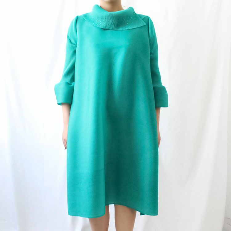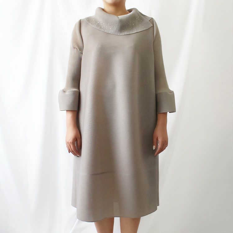 細かいプリーツをかけた生地ならではのふんわりと弾むようなシルエットを楽しめるワンピース。アシンメトリーなデザインの立ち襟にはカットガラスが煌めき華やかさをプラス。さらりとした身離れの良い生地で、快適な着心地です。
