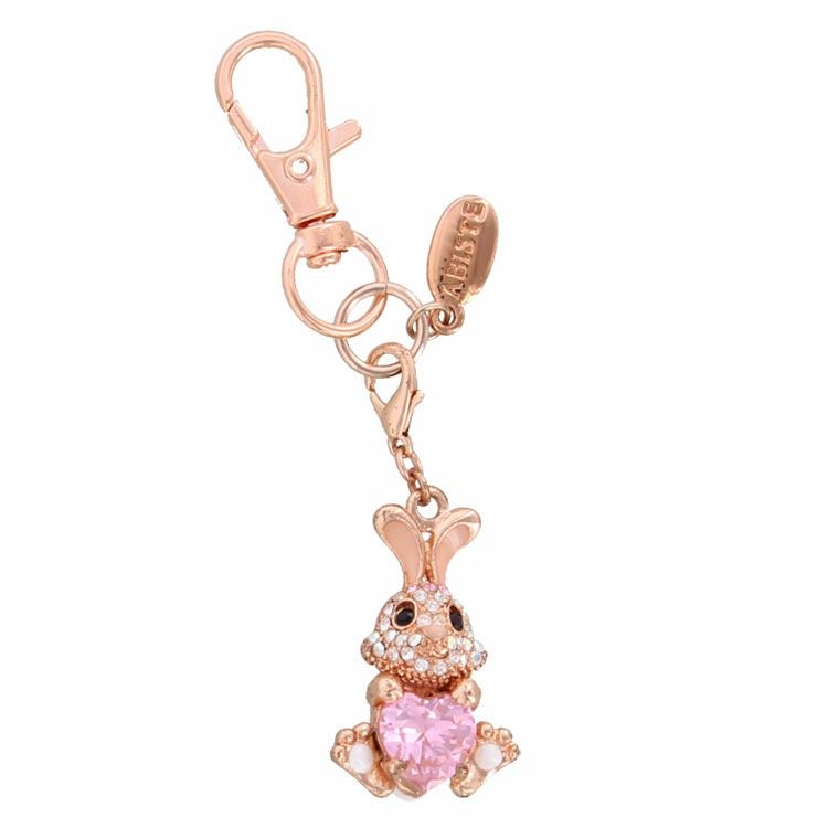 ハート型の大きなクリスタルを抱えたうさぎモチーフのキーチャーム。ぷっくりとしたフォルムと微笑んでいるような表情が愛らしく、見るたび気持ちを温かくしてくれそうです。