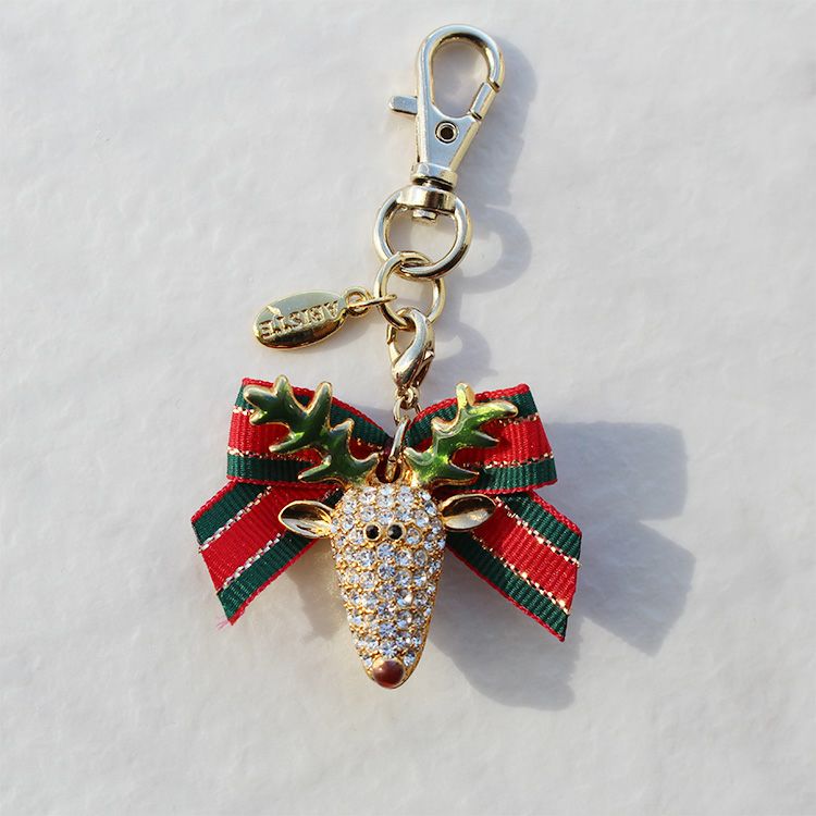 愛らしい表情のトナカイと、クリスマスカラーのグログランリボンをチャームにしたアイテム。キーホルダーやバッグチャームとしてお使いいただけます。