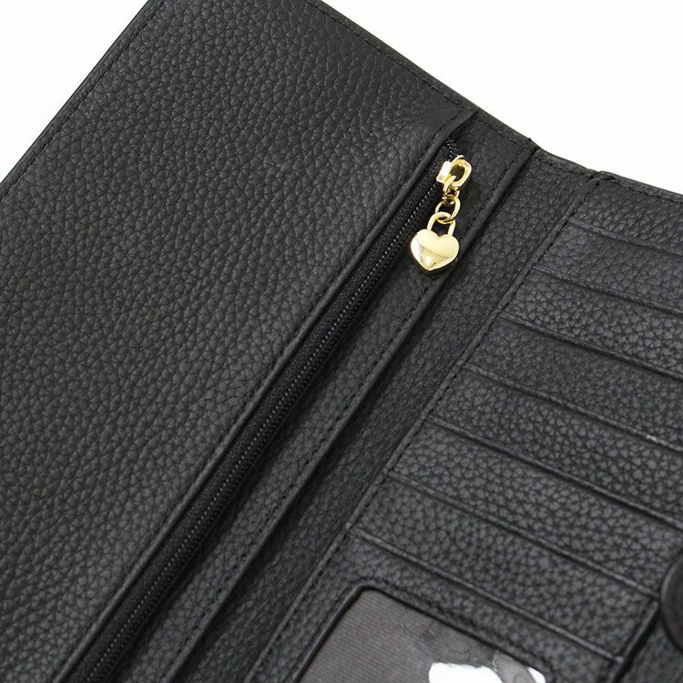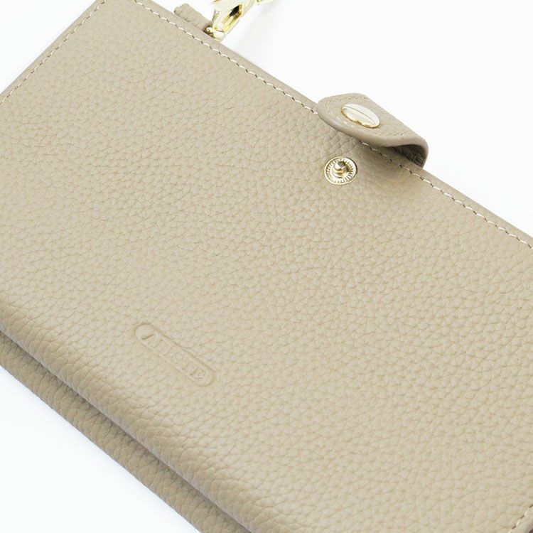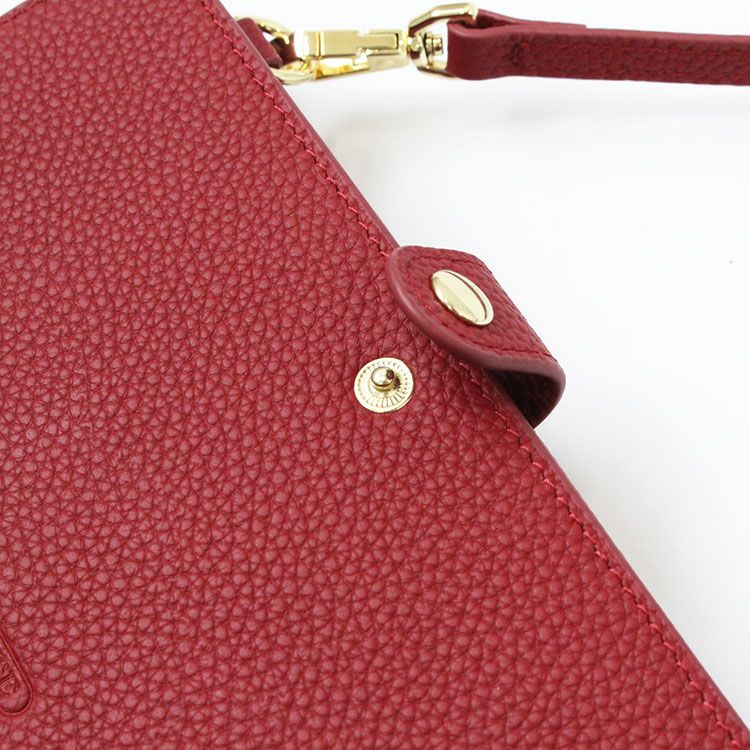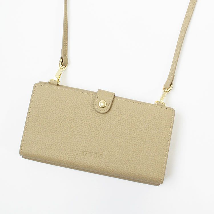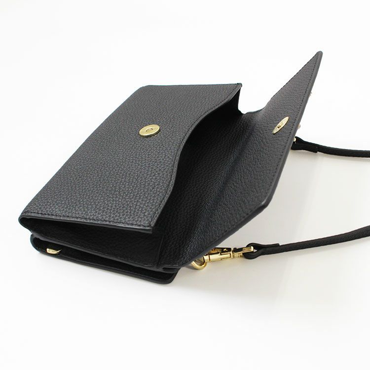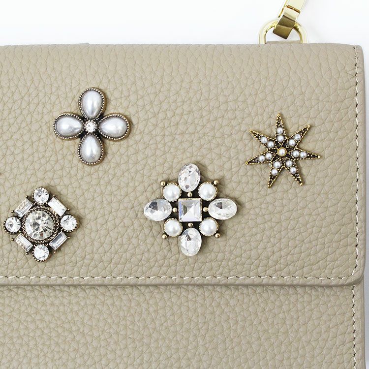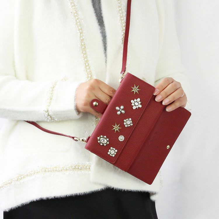 マットな質感の上品なシボレザー(牛革)に様々なビジューストーンを配した財布機能付きのショルダーバッグ。スマートフォンが入れられる正面のフラップポケットは三角形のマチにすることで大きく開いて取り出しやすいよう設計されています。背面はカードポケットが充実した財布になっており、チャーミングなハート型引き手のファスナーポケットには小銭が収納可能。