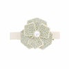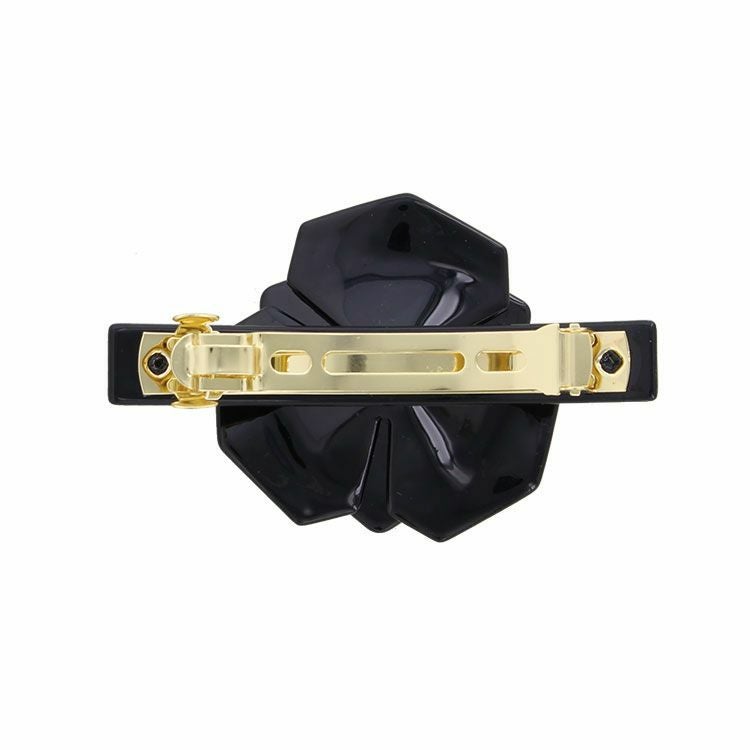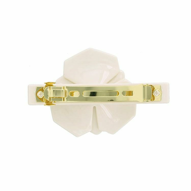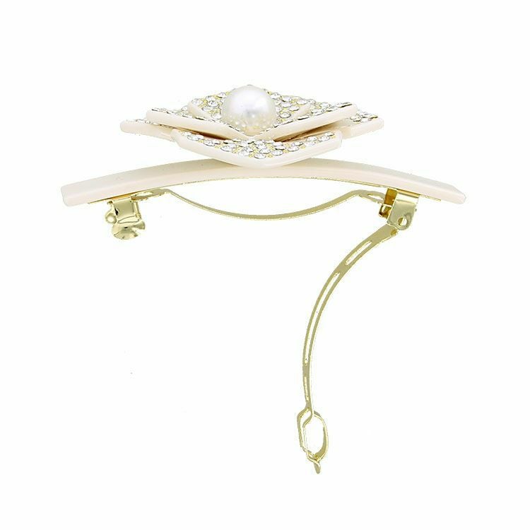 フラワーモチーフに小さなガラスストーンがキラキラ煌めくエレガントなバレッタ。中央に配置された大きなガラスパールが可愛さを引き立てています。地金はどちらもゴールドで、より華やかな印象をあたえます。