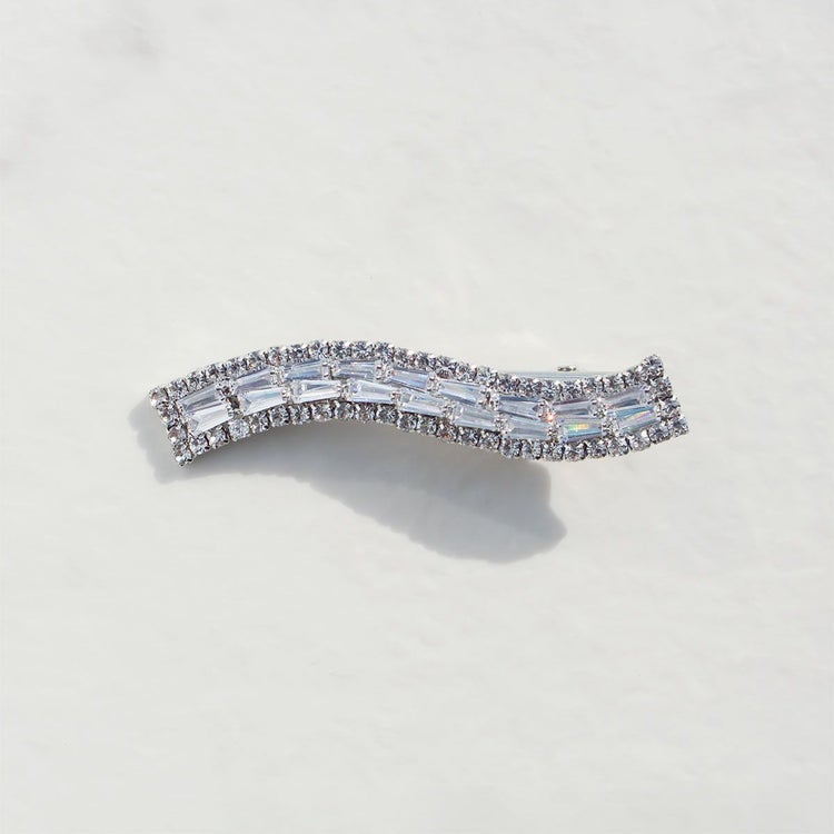 2種類の形のストーンが煌めくヘアクリップ。まとめ髪に2本並べて留めてもおしゃれ。シルバーにクリアストーンの組み合わせなので、デザイン違いのヘアクリップや、ネックレスなど他のアクセサリーとも組み合わせやすいデザインです。