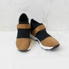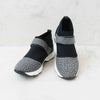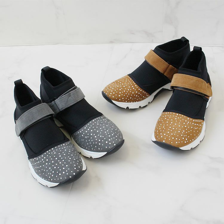 キラキラのクリスタルガラスがあしらわれたスエード調生地とウェットスーツのような柔らかい生地が用いられたスニーカー。スポッと履くことができ、ベルクロでフィット感の調節が可能。