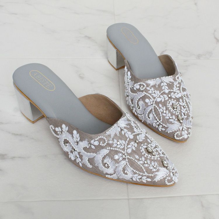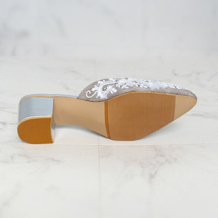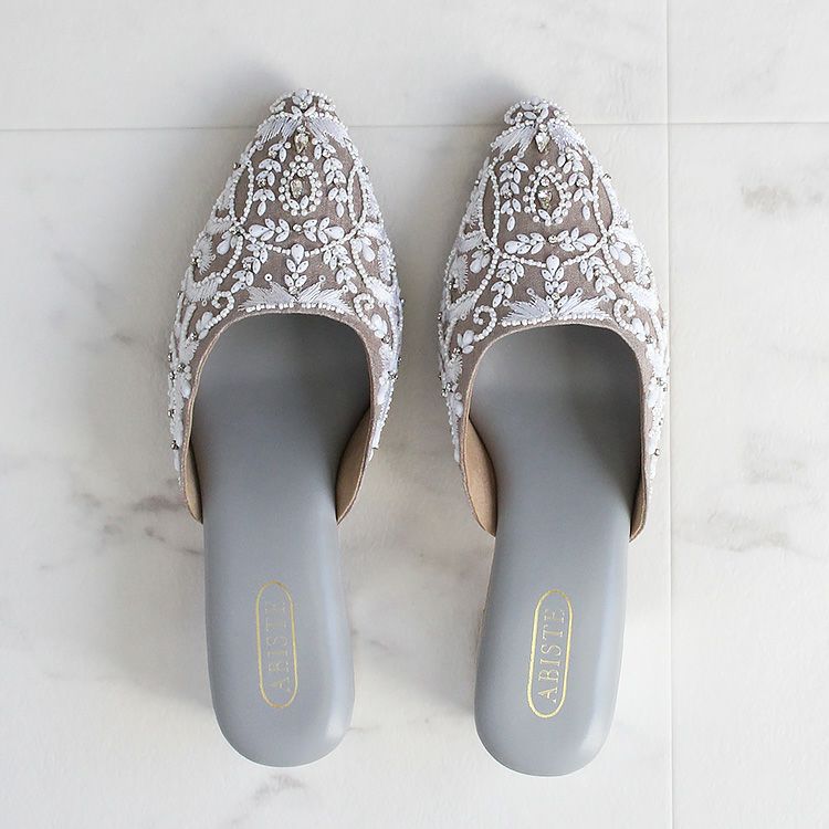優しいグレージュの生地に真っ白な糸、ビーズやクリスタルガラスで華やかな刺繍が施されたミュール。立体感のある刺繍は職人によって一つひとつ丁寧に作られています。