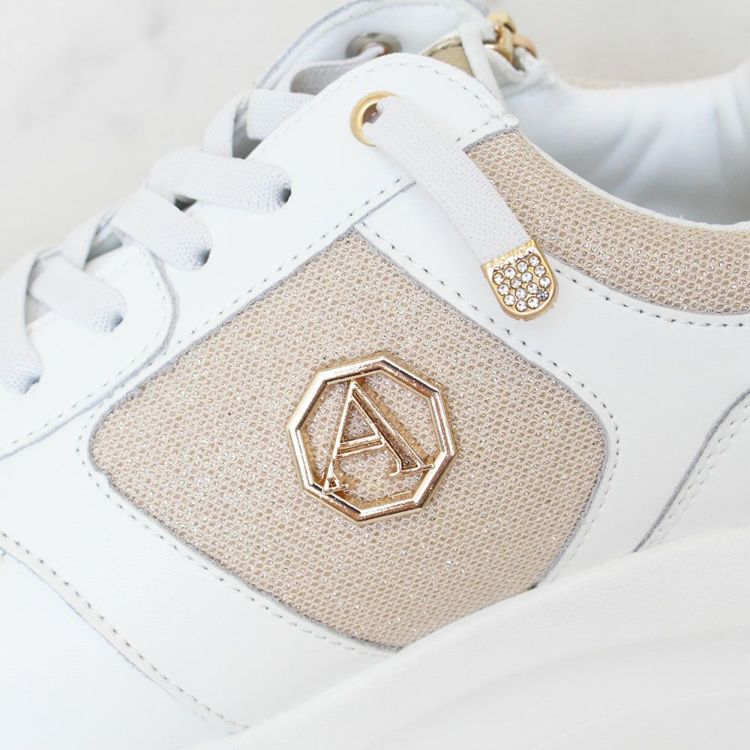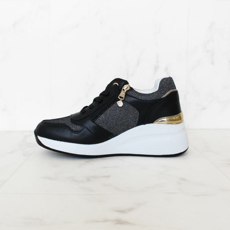 レザー(牛革)とラメ感のあるメッシュ生地を組み合わせたスニーカー。つま先は幅広すぎずきれいめなシルエットで、かかとの高いヒールアップ形状でスタイルアップ見えが叶います。ヒールスニーカーながら比較的軽量で、前部分の厚みもあるためヒールの高さも感じにくい設計。