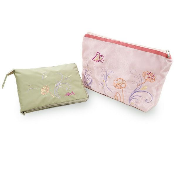 綿生地に光沢のあるオーガンジーで二重にした上から、お花や蝶々などのエレガンスな刺繍をほどこしたのが、シリカゲル入りのシューキーパーとスリッパ、マルチポーチと衣類用巾着袋。