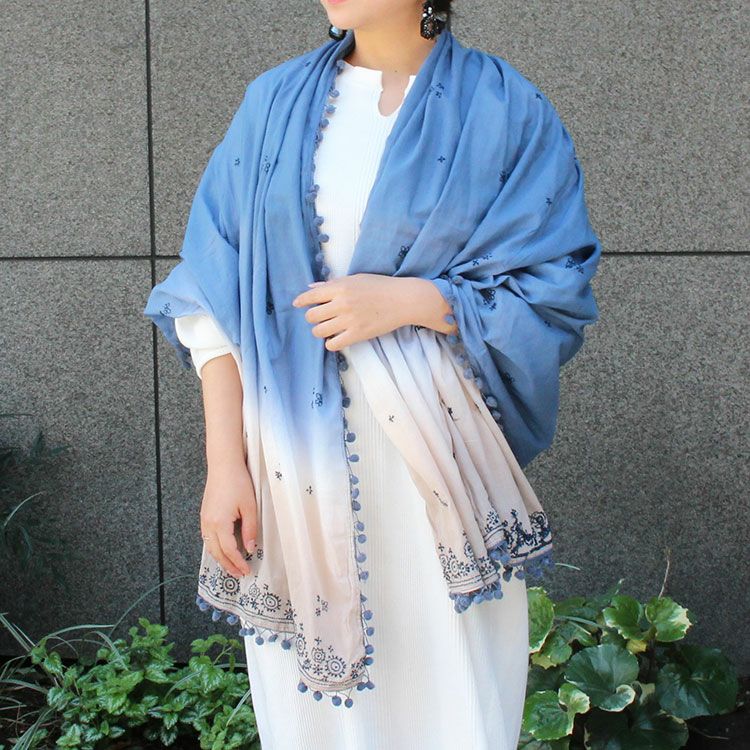 インド綿100%の大判ストール。寒暖差が大きい季節に重宝する大判サイズです。インディゴの柔らかな色味がナチュラルな雰囲気を演出。合わせやすく普段使いに最適です。インド刺繍とストールの周りのポンポンがかわいらしさを醸し出しています。