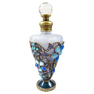ブルーのすりガラスのパフュームボトル。実際に香水を入れるのはもちろん、お部屋を飾るアイテムとして使っても気分が上がります。