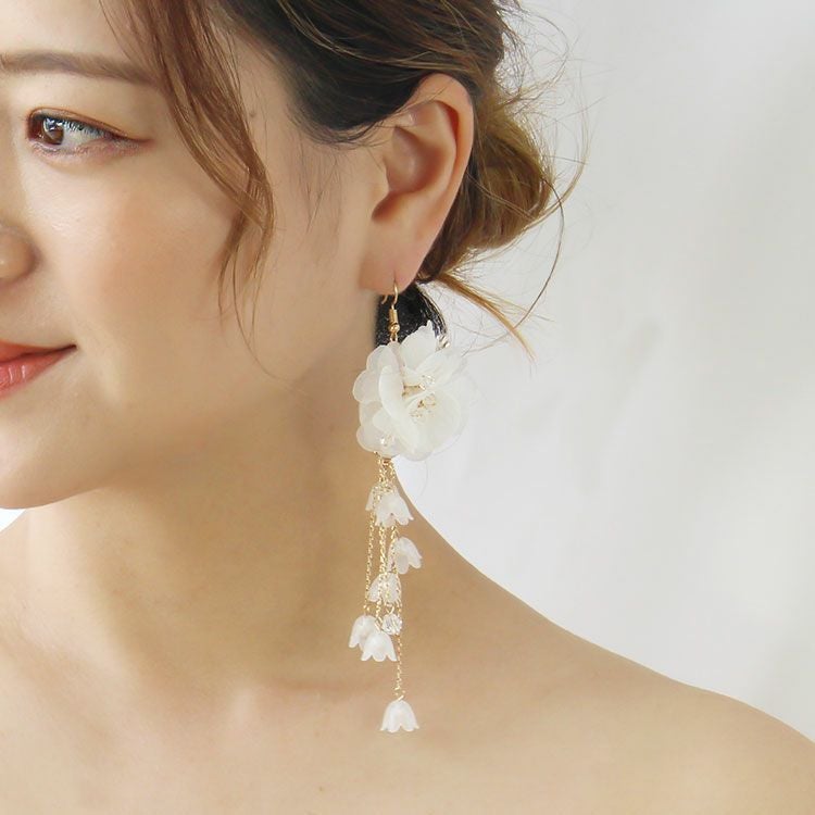 ふわふわのシフォンフラワーに、さらさらとチェーンが揺れ動くロマンティックなデザインのピアス。チェーンにはすりガラスのようなすずらんモチーフ。幸福を花言葉に持つすずらんは、ブライダルなど特別なシーンにもぴったりです。