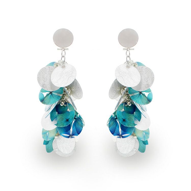 本物のアジサイの花をレジンに閉じ込めたアクセサリー。ボリュームがありながらもとても軽くてカラフル♪身に着けるとハッピーで明るい気分にしてくれます。