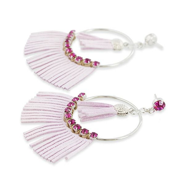 レザー調のフリンジが目を惹く大ぶりのピアス。カラーを変えたクリスタルガラスが華やかさをプラスしています。耳を出したヘアスタイルで、しっかりとピアスを見せるのがオススメ。大ぶりなイヤーアクセサリーは顔周りを華やかにするだけでなく、顔を小さく見せてくれる効果も。