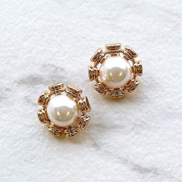 大粒のカボションパールがお顔周りを華やかにし、メタル使いがあることでカジュアルから上品コーデまで出番の多いイヤリング。