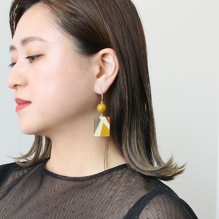 トーンに変化を持たせた一つのカラーをアイボリーホワイトで区切った幾何学柄のピアス。