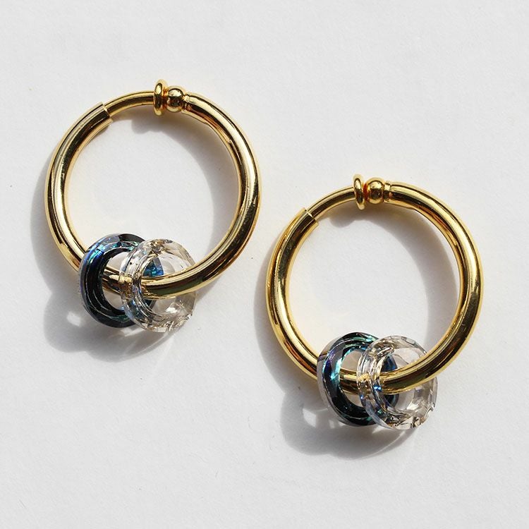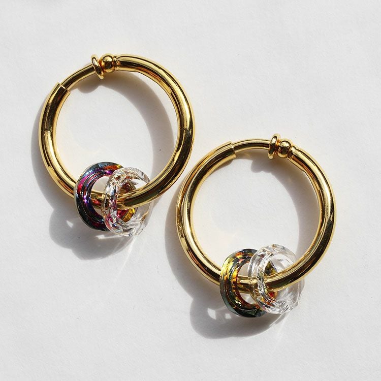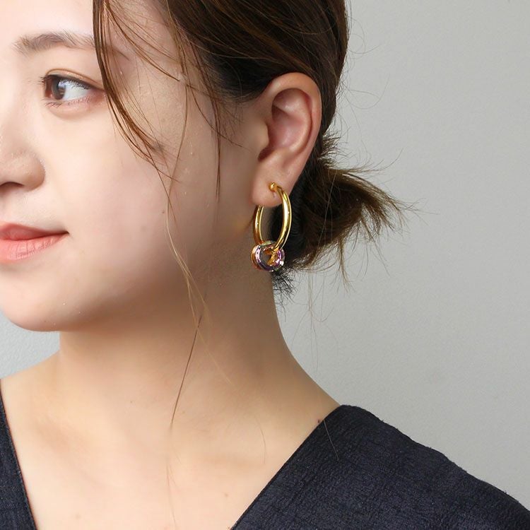 サークルのクリスタルが煌めくフープイヤリング。イヤリングながらピアスのように見える人気のフープタイプです。装いを選ばず使いやすい、必ずひとつは持っておきたいデザイン。揺れるモチーフは取り外しが出来るので、2wayでお楽しみいただけます。