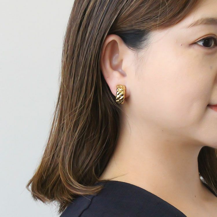 編み込んだようなデザインが特徴的なハーフフープイヤリング。小さすぎず、かつ大ぶりすぎないサイズ感と凹凸のある形状が、使いやすさと「シンプルながらもちょっと差がつく」を両立。シーンや年代を選ばずご愛用いただけるデザインで、ギフトにもオススメです。