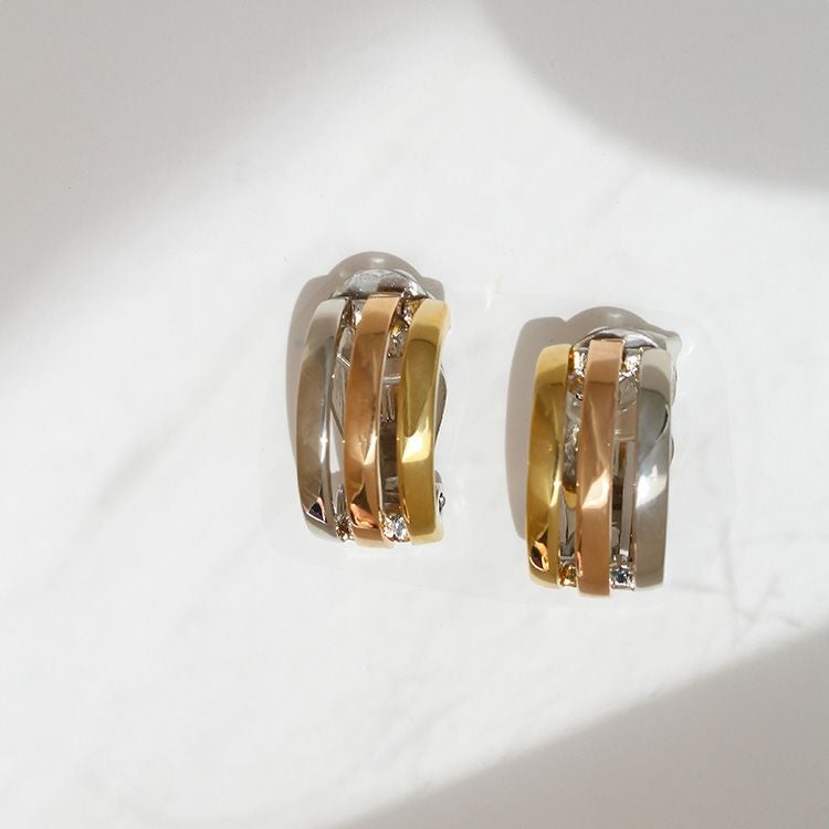 シルバー、ゴールド、ピンクゴールドのメタルが三位一体となったイヤリング。正面からは規則正しく並ぶ直線的でスタイリッシュなデザイン、横から見ると柔らかさのあるハーフフープ状のデザイン。定番人気のシンプルな地金アクセサリー、かつクラス感があり、シーンや年代を選ばずご愛用いただけます。
