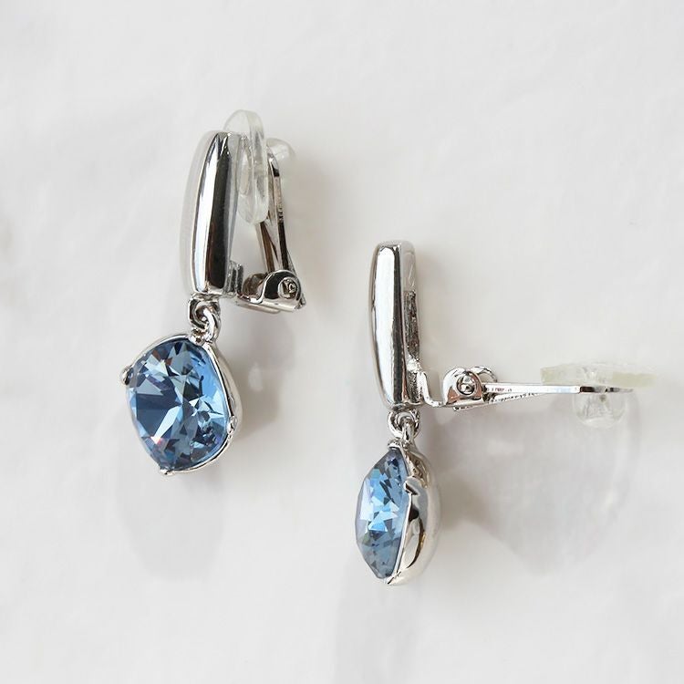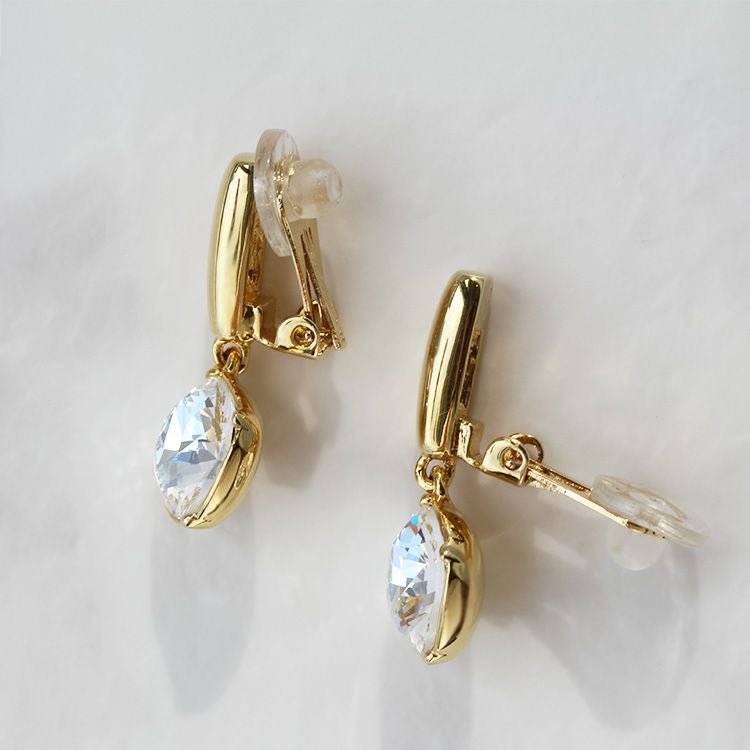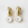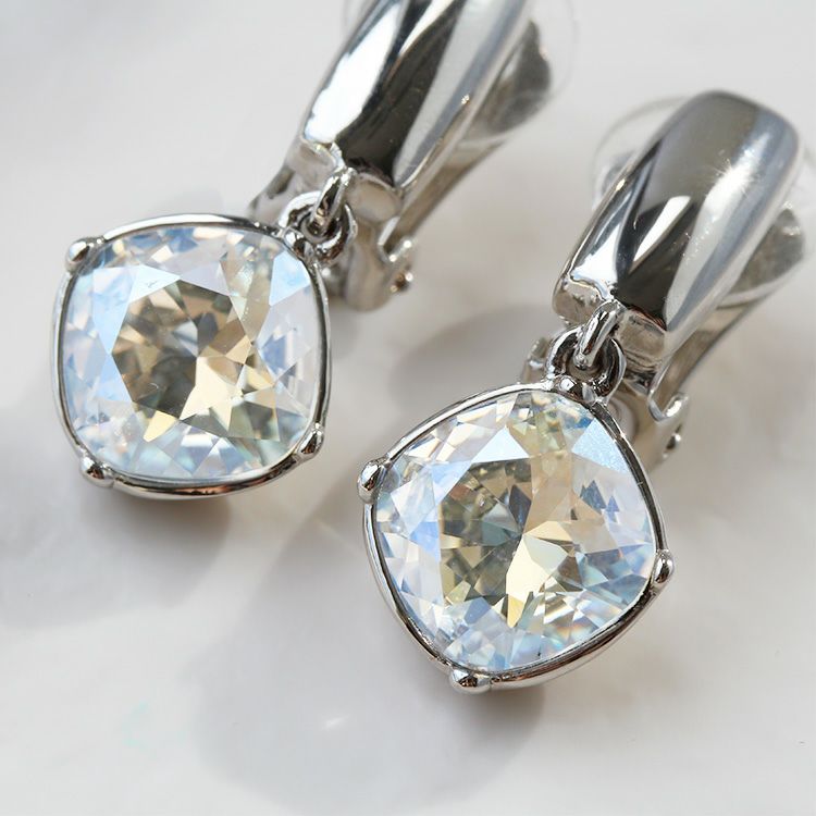 大粒のビジューが華やかなイヤリング。四角形の角を落としたクッションカットは、スクエアの持つシャープで凛とした印象と、柔らかい印象を併せ持つジュエリーでも人気のシェイプ。スタイリッシュなメタルのバーと合わせた、どんな洋服やアクセサリーとも合わせやすいデザインです。