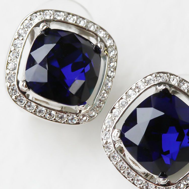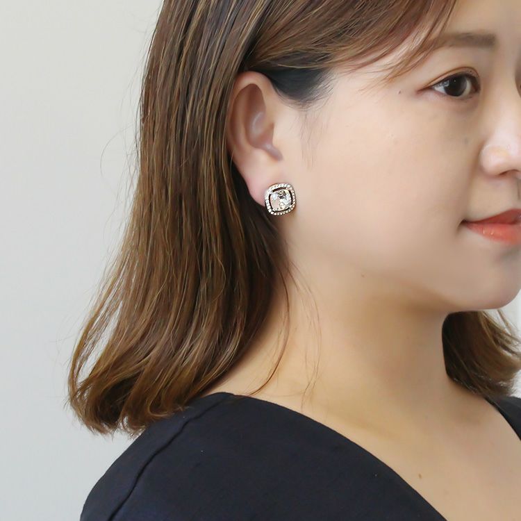 大粒のビジューが華やかなイヤリング。四角形の角を落としたクッションカットは、スクエアの持つシャープで凛とした印象と、柔らかい印象を併せ持つジュエリーでも人気のシェイプ。どんな洋服にも合わせやすく、デイリーから特別なお出かけまで幅広く活躍してくれます。光の反射が美しいので、ブライダルシーンやステージ衣装などにもオススメ。