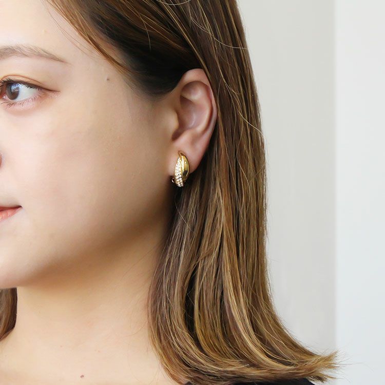 シーンや年代を選ばずご愛用いただける、エレガントなデザインのメタルイヤリング。艶のあるゴールドメタルとパヴェ状に配されたクリスタルガラスの輝きが、シンプルながらも装いのアクセントに。