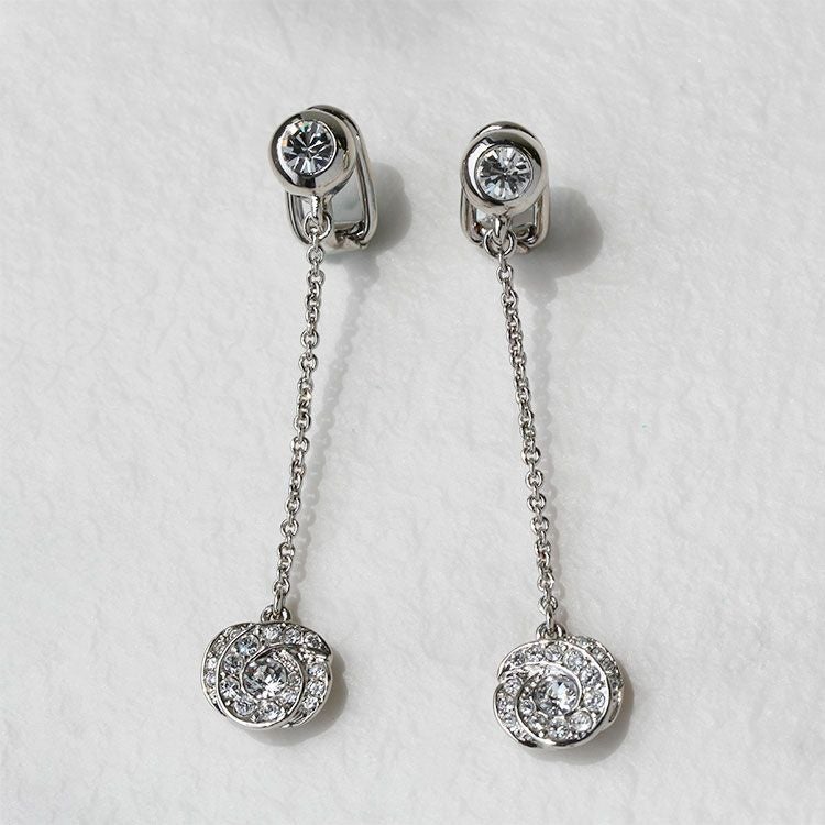 繊細なチェーンの先にチェコガラスを敷き詰めたバラのモチーフが揺れるイヤリング。華やかさはありつつ品の良いデザインです。