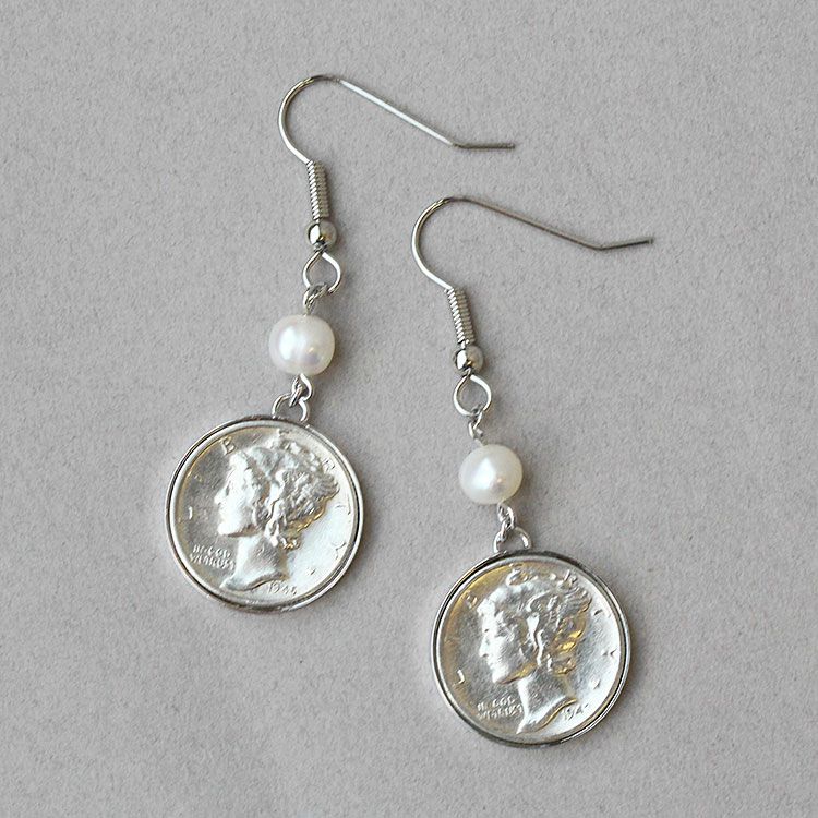 アメリカ10セントマーキュリーダイムコイン×パールロングピアス