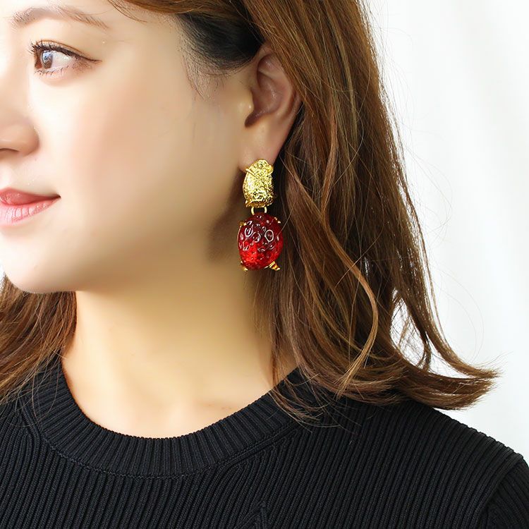 イチゴの果肉のようなモチーフが印象的なアンティーク調デザインロングピアス。遊びゴコロあふれる大ぶりのデザインはコスチュームジュエリーならでは。パーティーシーンや会食、外出時はもちろん、普段使いに、コーディネートのアクセントにご利用ください。