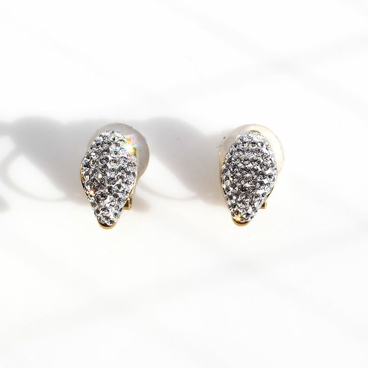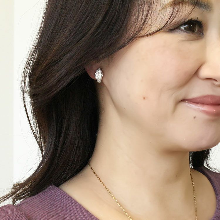アーチ状に緩やかなカーブを描くリーフモチーフデザインイヤリング。表面にはパヴェ状にチェコクリスタルが敷き詰められ輝きを放っています。 シンプルなデザインなのでフォーマルや普段使いにと重宝しそう。 ステンレス製でアレルギー反応を起こしにくく、丈夫で気兼ねなく使えるのが嬉しいポイント。