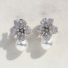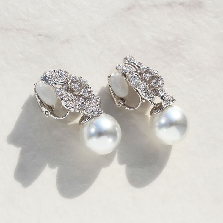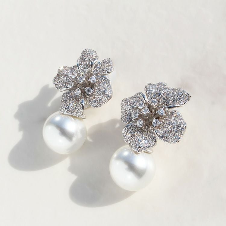 キュービックジルコニアがパヴェ状に敷き詰められた花びらが美しい、フラワーモチーフのイヤリング。ピュアホワイトのパールは14mmの大粒。華やかさが際立ちます。