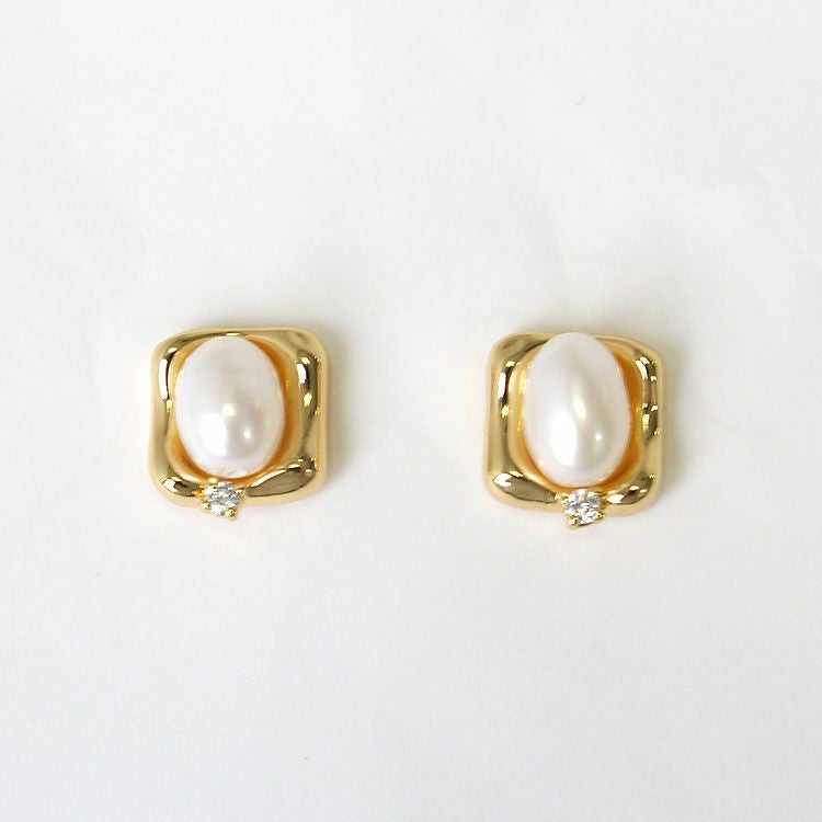 スクエアメタルフレームの中にやわらかくなめらかな輝きを放つ淡水パールが配置されたデザインピアス。パールの下に煌めく一粒のキュービックジルコニアが華やかさをプラスしています。洗練された上品なデザインは、カジュアルはもちろん、オフィス使い、フォーマルまでさまざまなシーンでお使いいただけます。