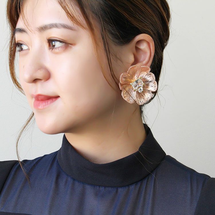 コッパーワイヤーを繊細な手仕事でお花のように編み上げたフラワーモチーフ×ビジューイヤリング。しっかりとした艶感がありながらも、しなやかな表面感が魅力的なデザインはまるで芸術作品のような美しさ。中心に煌めくキュービックジルコニアがより華やかさをUPさせています。 パーティーや会食、女子会、カジュアルシーンなど幅広くご利用いただけます。