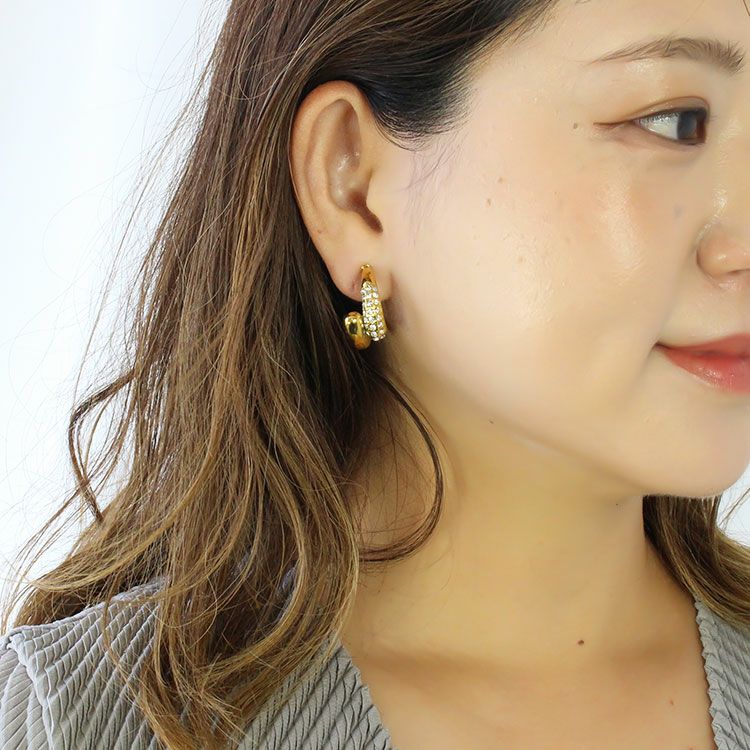 細かなクリスタルガラスがニュアンスデザインに配置されたハーフフープイヤリング。 おしゃれで華やかなデザインは、女子会やお買い物などのデイリー使いから、パーティーシーンまで幅広くご利用いただけます。ステンレス素材を使用しているので変色しづらく季節を問わずつけやすいのが特徴です。