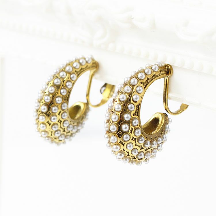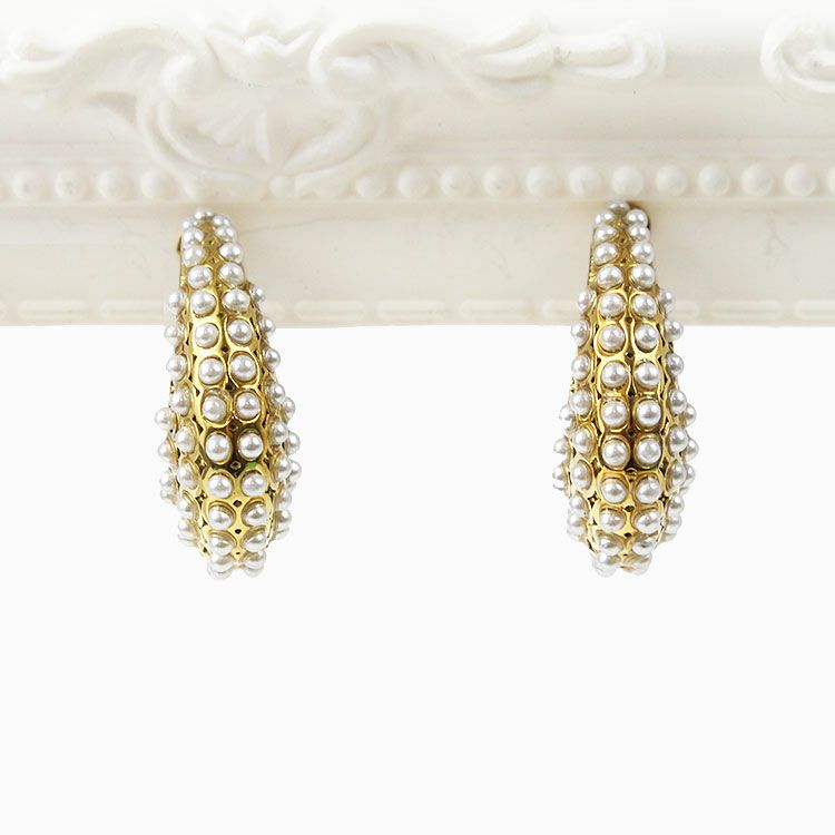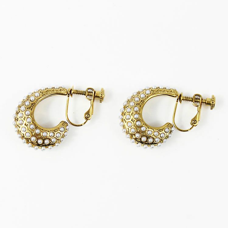 小さなパールが全面に配置されたハーフフープイヤリング。 おしゃれで華やかなデザインは、女子会やお買い物などのデイリー使いから、パーティーシーンまで幅広くご利用いただけます。ステンレス素材を使用しているので変色しづらく季節を問わずつけやすいのが特徴です。