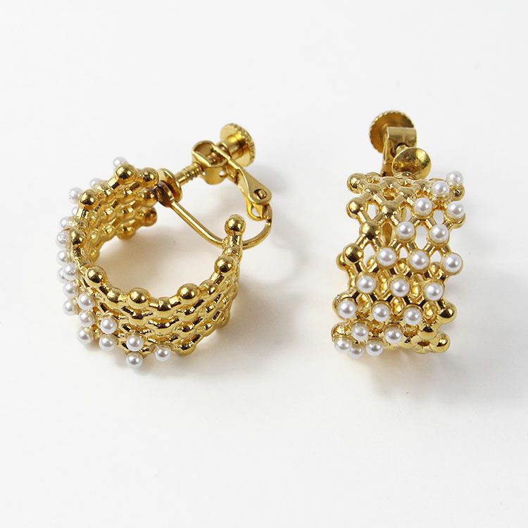 メタルメッシュに小さなパールが斜めに配置されたハーフフープイヤリング。 おしゃれで華やかなデザインは、女子会やお買い物などのデイリー使いから、パーティーシーンまで幅広くご利用いただけます。ステンレス素材を使用しているので変色しづらく季節を問わずつけやすいのが特徴です。