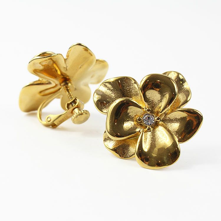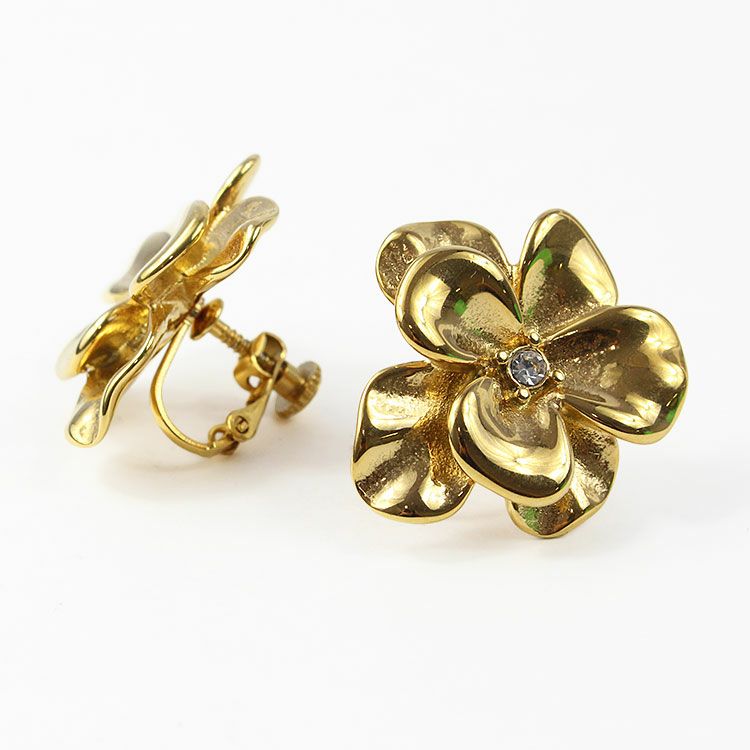フラワーモチーフの中央に小さなクリスタルガラスが配置されたメタルフラワーイヤリング。 おしゃれで華やかなデザインは、女子会やお買い物などのデイリー使いから、パーティーシーンまで幅広くご利用いただけます。ステンレス素材を使用しているので変色しづらく季節を問わずつけやすいのが特徴です。