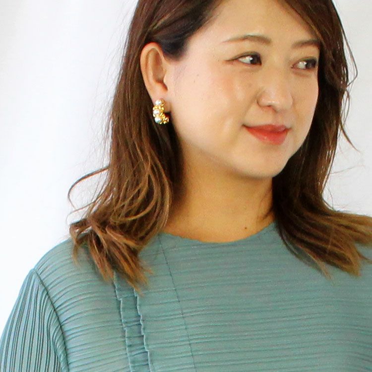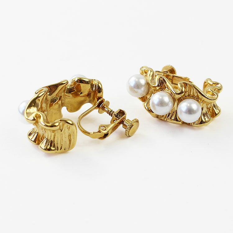 リボンのひだにパールが配置された、どこかクラシックな印象のメタルハーフフープイヤリング。 おしゃれで華やかなデザインは、女子会やお買い物などのデイリー使いから、パーティーシーンまで幅広くご利用いただけます。ステンレス素材を使用しているので変色しづらく季節を問わずつけやすいのが特徴です。