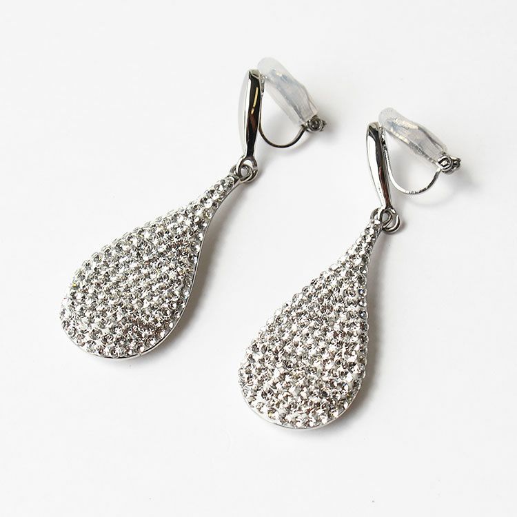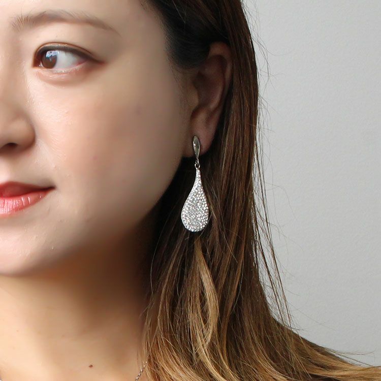 チェコクリスタルがパヴェ状に敷き詰められたドロップモチーフイヤリング。大ぶりで華やかなデザインは、カジュアルな女子会やお買い物、お食事はもちろん、パーティーシーンにもおすすめ。ステンレス素材を使用しているので変色しづらく季節を問わずつけやすいのが特徴です。