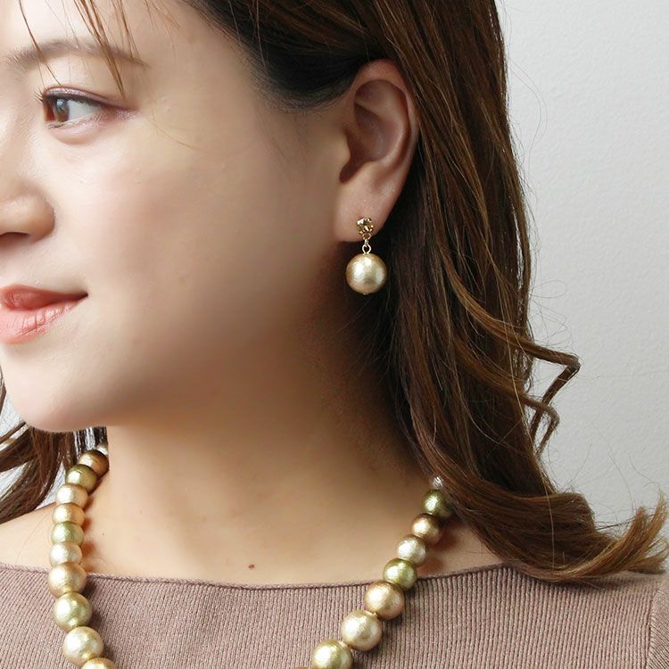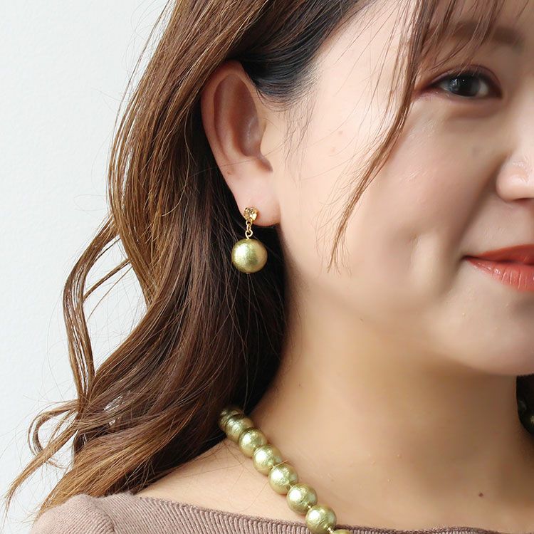 綿を圧縮して形成し、その上からパール塗装を施して作られるコットンパールは、繊維による細かい凹凸が特徴で、温かみのある質感を醸し出しています。驚くほどの軽さと、ひとつ一つが真円ではなく、少し歪んだ形状をしていることも、ナチュラルな魅力となっています。