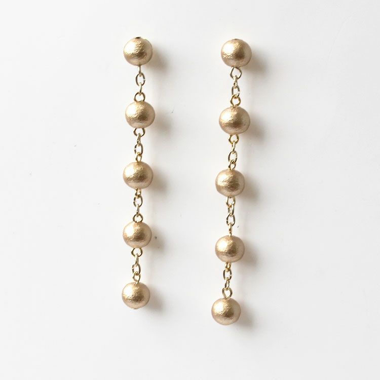 綿を圧縮して形成し、その上からパール塗装を施して作られるコットンパールは、繊維による細かい凹凸が特徴で、温かみのある質感を醸し出しています。驚くほどの軽さと、ひとつ一つが真円ではなく、少し歪んだ形状をしていることも、ナチュラルな魅力となっています。