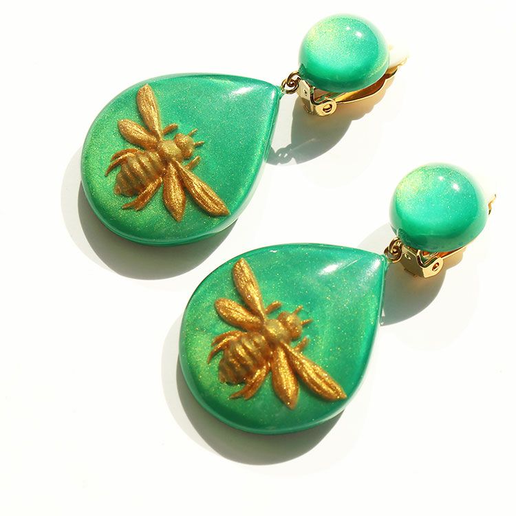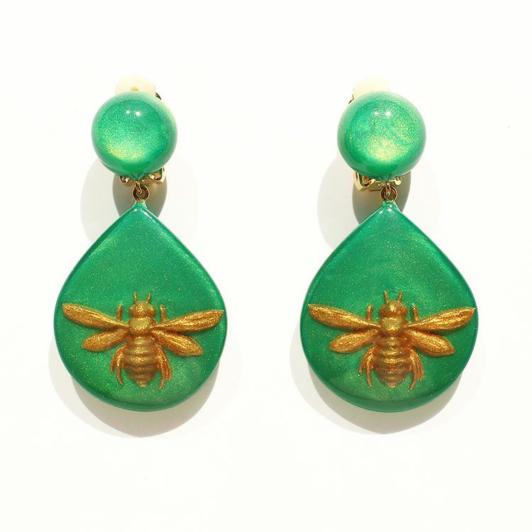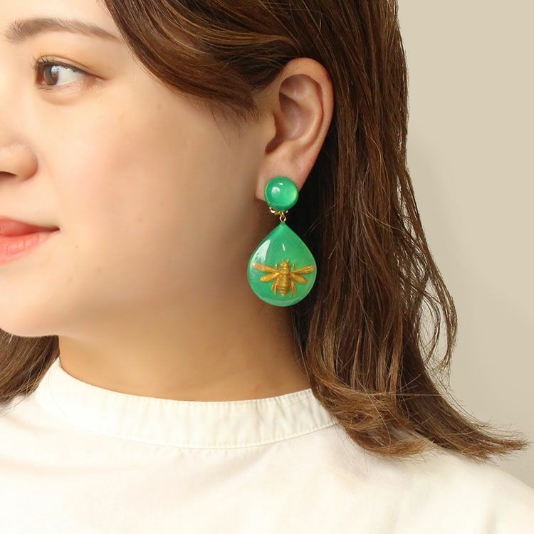 英語で『至福』を意味するBLISS。無上の喜びを得た時の感情をイメージし、印象深く、幸せを惹きつけるような魅力に溢れたデザインです。美しいなエメラルドグリーンのハチをモチーフにした、ハンドメイドの樹脂製イヤリング。
