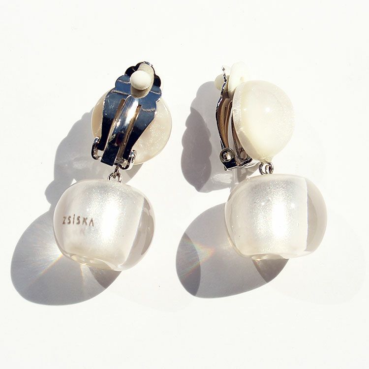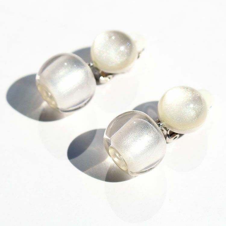 英語で『至福』を意味するBLISS。無上の喜びを得た時の感情をイメージし、印象深く、幸せを惹きつけるような魅力に溢れたデザインです。煌めくホワイトグリッターが美しいハンドメイドの樹脂製イヤリング。