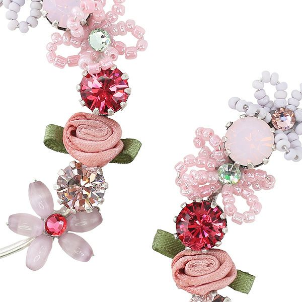 リボンやビーズなどの素材で作られたフラワーモチーフが飾る大きなフープピアス。3色の大粒クリスタルガラスが華やかさを一層させてくれます。