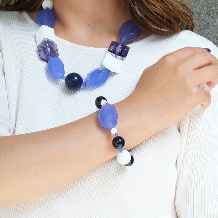 ブルーと白のアクリルビーズの色合いが美しいイタリア製ブレスレット。パッと目をひく洗練されたデザインはイタリア製ならでは。ゴム式なので着脱もスムーズ。