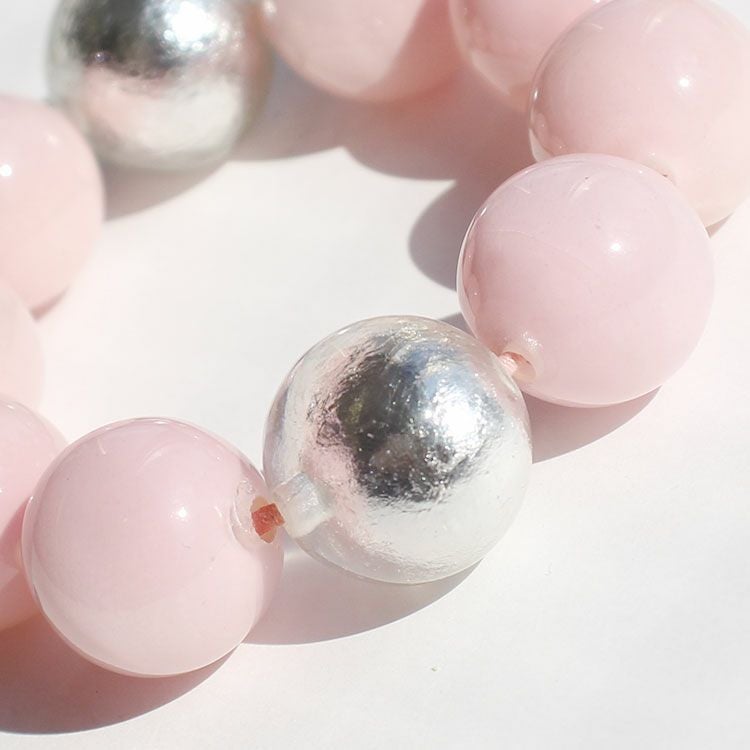 優しいピンク色に銀箔をレジンで閉じ込めたパーツがアクセントになったブレスレット。ゴムタイプなので着脱がしやすく、ストレスフリーなデザインです。