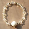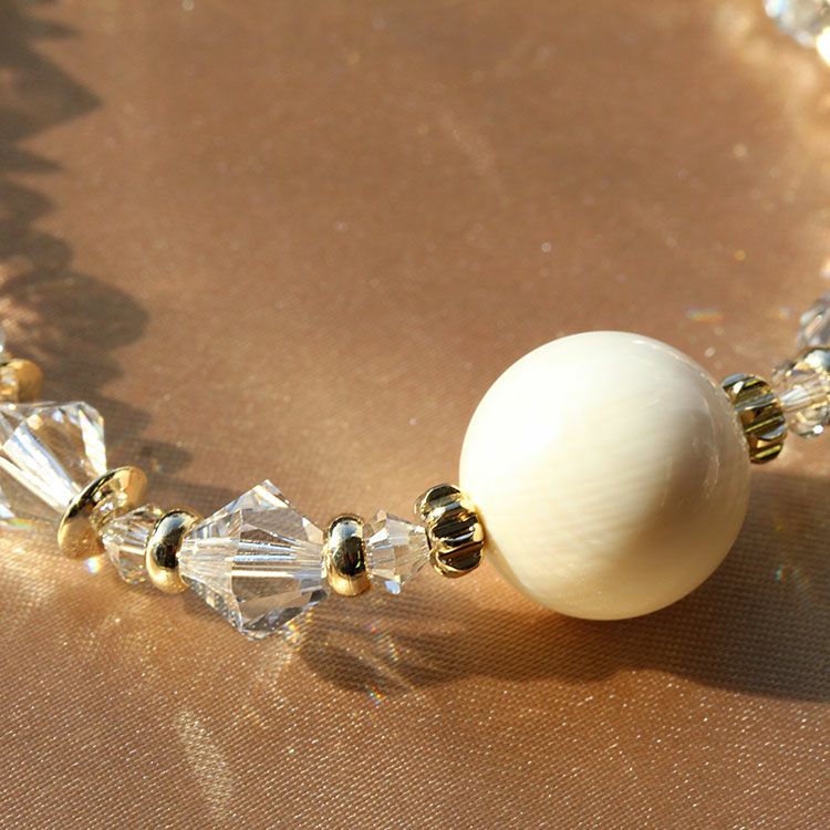 約3万年前の氷河期に生息していたマンモスの牙を使用したブレスレット。ボール状に加工したマンモスのパーツに、マンモスが生きた氷河期をイメージして、クリスタルガラスのビーズをあしらったデザインです。着脱しやすいゴム式です。