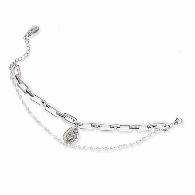 ステンレス製のチェーンデザインブレスレット。小粒のパールブレスレットと重ね付けをしているような、旬のレイヤードデザイン。