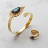 繊細なメタルで形作られたリーフモチーフに、爽やかなブルーのターコイズとクリスタルガラスが輝くバングルとリングのセット。