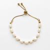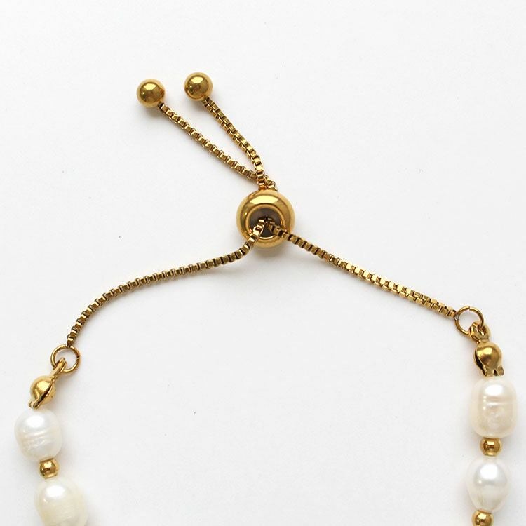 やわらかくなめらかな輝きを放つ淡水パールのデザインブレスレット。ゴールドのメタルビーズがアクセントになってキリっと洗練された雰囲気を印象付けています。シリコン入りストッパーをスライドさせてサイズ調節ができるアジャスター付きで、微妙なサイズ調整がスムーズです。カジュアルはもちろん、オフィス使い、フォーマルまでさまざまなシーンでお使いいただけます。