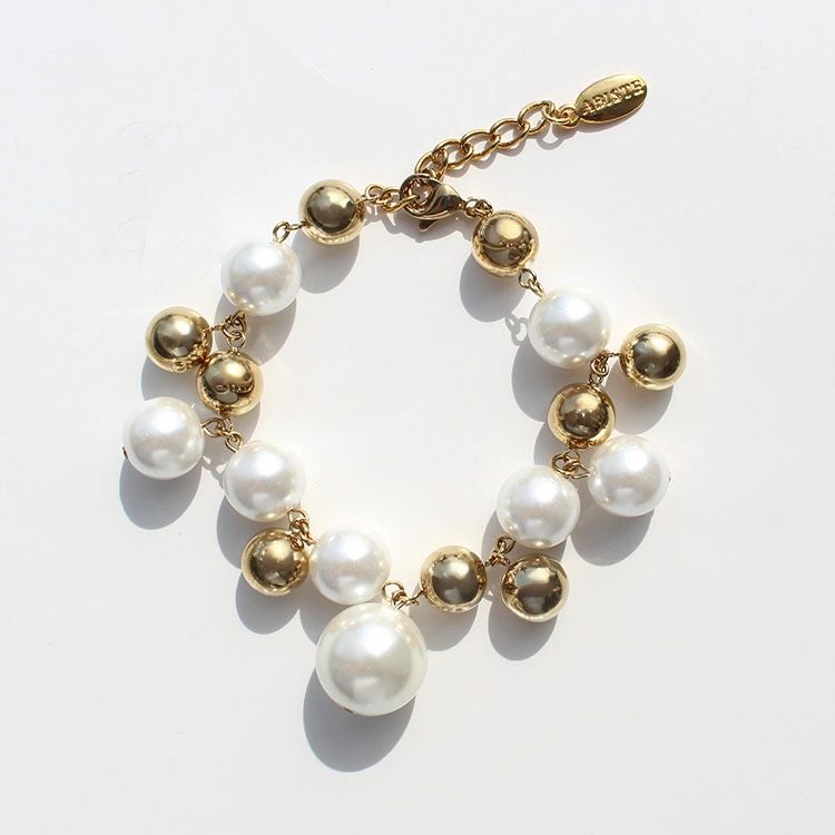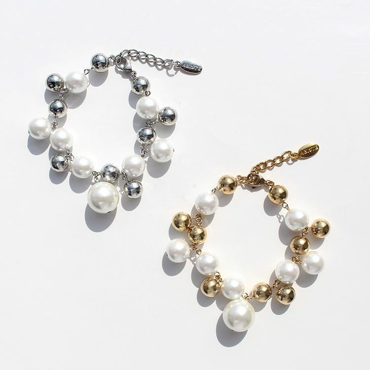大小パールボールとメタルボールがランダムに組み合わさったブレスレット。大ぶりで存在感があるおしゃれなデザインは、洗練されたスタイリッシュな印象。女子会やお買い物はもちろん、パーティーシーンにもおすすめです。